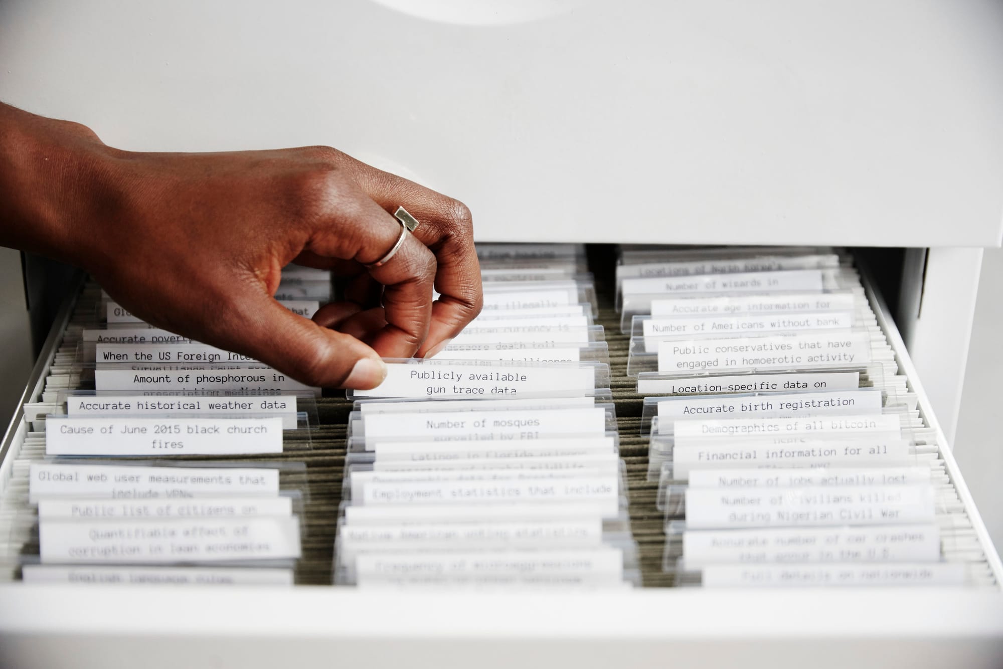 Данные не возникают из воздуха, и хотя это очевидно, мы не всегда задумываемся о том, откуда они к нам приходят и почему одних данных много, а других — мало или вовсе нет. Это довольно весомое упущение, ведь иногда ответы на наши вопросы кроются не столько в таблицах или графиках, сколько в их «родословной». Озадачиться вопросом о происхождении данных как раз призывает американская художница Мими Онуоха в своем проекте «Библиотека упущенных датасетов».