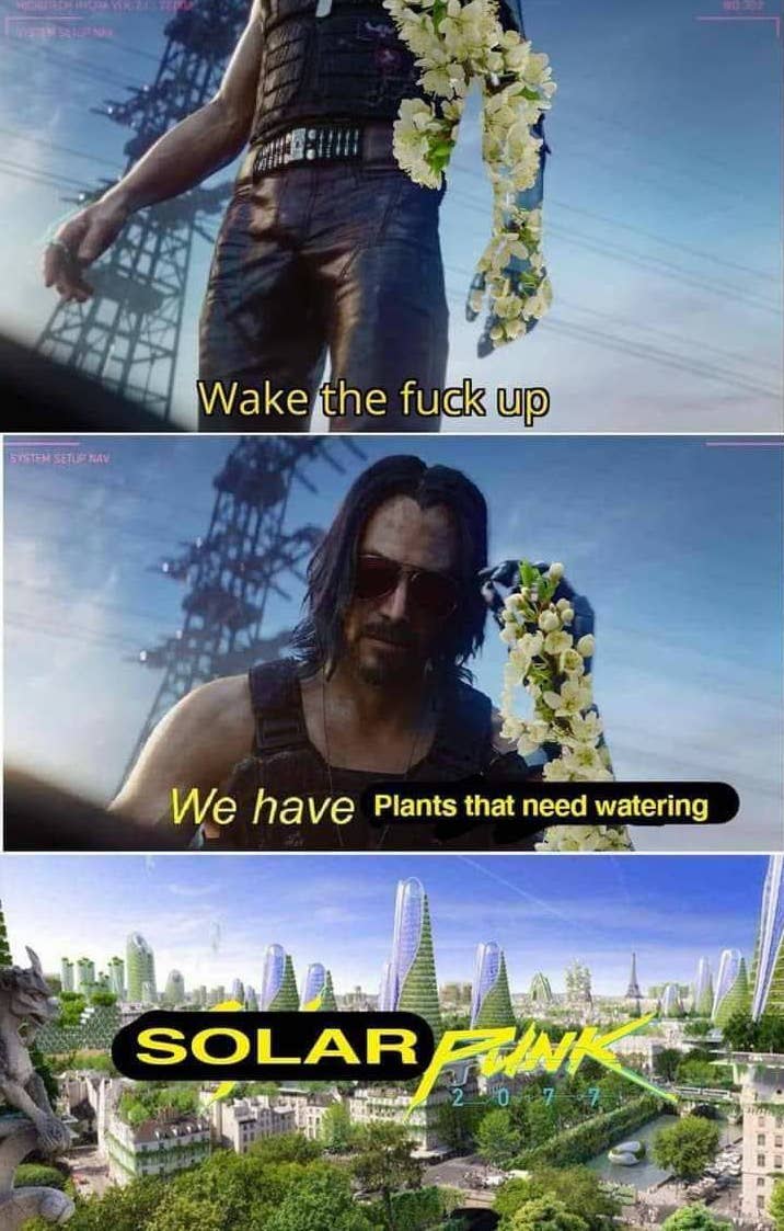 Соларпанк, представленный галереями рендеров «экогородов будущего», не выродился исключительно в цифровую эстетику. Панк в соларпанке — это садовник или инженер, отказавшийся от капиталистической модели устройства своей жизни; создатель, который делает мир сегодня чуточку лучше, чем он был вчера, энтузиаст и экспериментатор различных ремесел. Это идея за фасадом красивого мира, где свежо, солнечно и в меру влажно. Идея, что мы можем отказаться от разобщенности и создать настоящее вместе, а не бояться судьбы, навязанной политиками, корпорациями и антиутопистами, поодиночке. Соларпанк — это критика безнадежности. И самое страшное, что может случиться с этим жанром — повторение судьбы киберпанка, оцепенение в красивых картинках.
