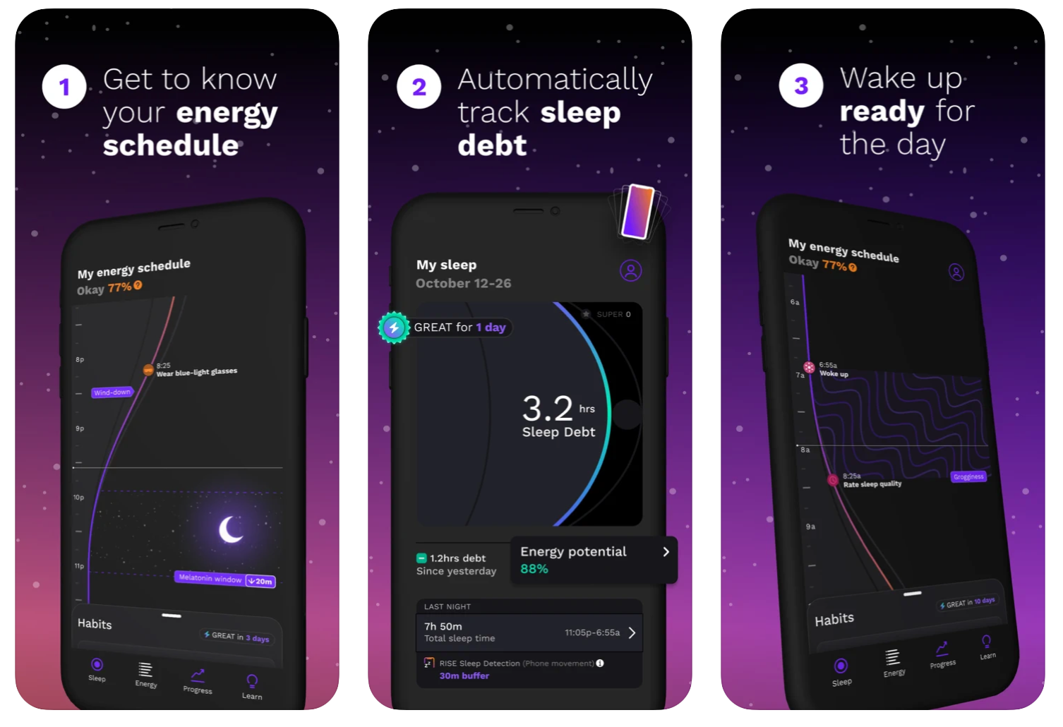 Создатели приложения считают, что для качественного сна нужно анализировать всего два показателя: циркадные ритмы человека и количество часов или минут, которых пользователю не хватило, чтобы выспаться за ночь. Собирая данные о сне и дневной активности, приложение высчитывает периоды подъема и спада вашей энергии, а затем рекомендует оптимальное время для отхода ко сну и количество часов, которое понадобится, чтобы с утра почувствовать бодрость. В Rise уверены: недосып можно компенсировать за выходные, но подходить к этому нужно грамотно — для этого и пригодится приложение.